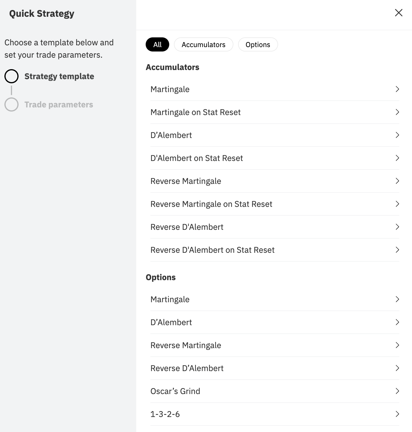 For users who don't want to build from scratch, Deriv Bot includes ready-made templates for popular trading methods, organised by trade type — Accumulators and Options. Highlighting these reduces the "intimidation factor" for your audience.