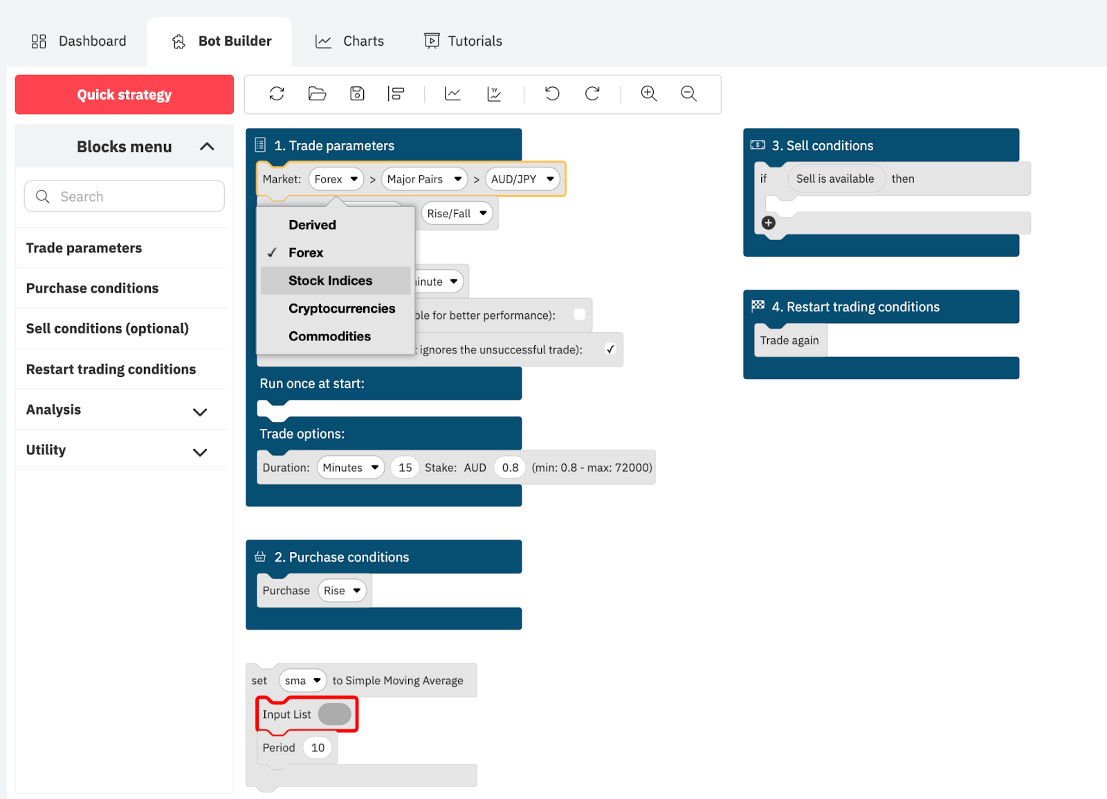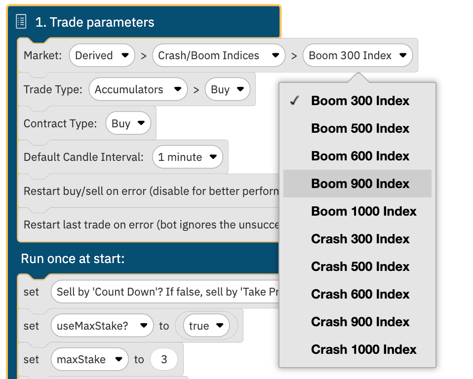 - Show the 4-step process: Demonstrate choosing an asset, setting purchase logic, setting restart logic, and running the bot. Use screenshots or screen recordings from the Deriv Bot interface to make this tangible.